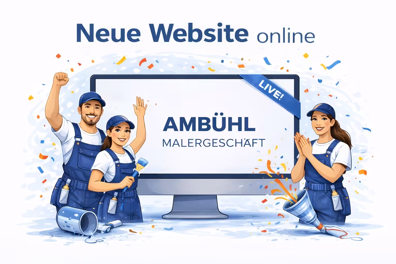 Neue Website von Ambühl Malergeschäft online: Feierliche Künstler in Blau begrüßen digitalen Relaunch.
